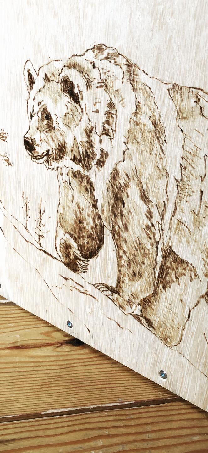 Have your Muskoka chair a one-of-a-kind! Artist Katherine Mathewson wood burns freehand anything you’d like: name, logo, address, flowers, birds, nature, various details, inspiring quotes.